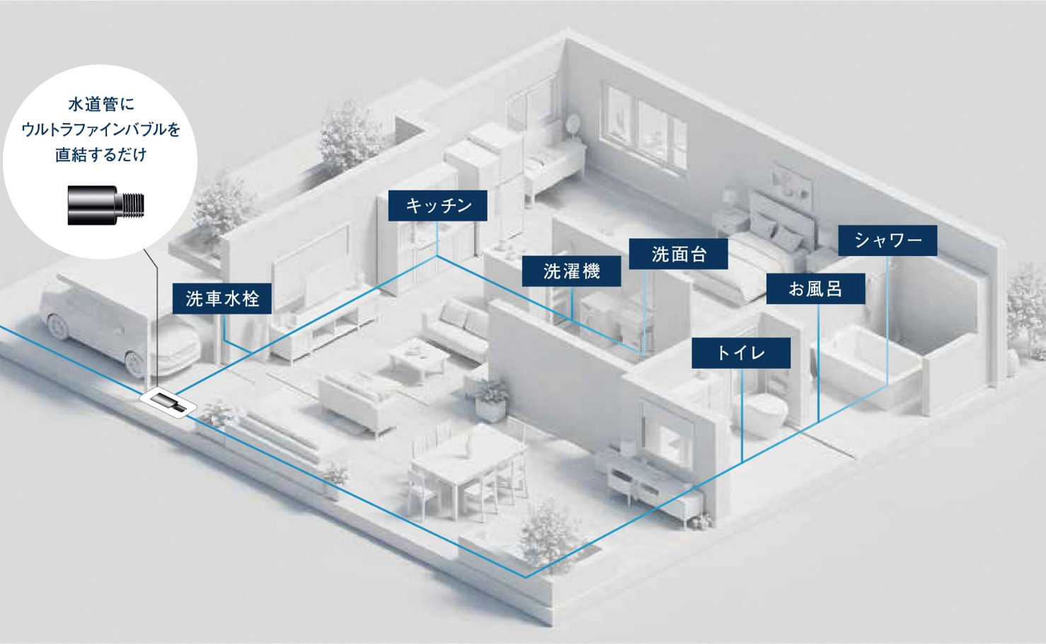 アイ工務店の住まいでは、水道の引込管に専用のUFB機器を設置することで、家中すべての水がウルトラファインバブル水に。