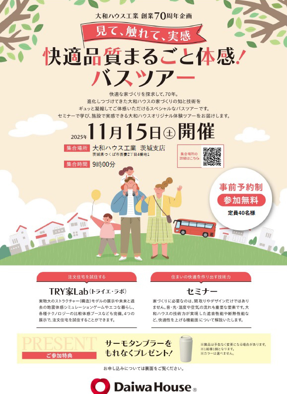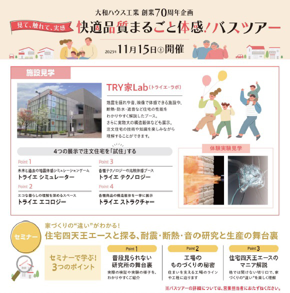 実物大の構造の展示や未来と過去の地震体感シミュレーターなど各種テクノロジーの比較体感ブースを完備したダイワハウスのTRY家Lab(トライエ・ラボ)をご案内いたします。
