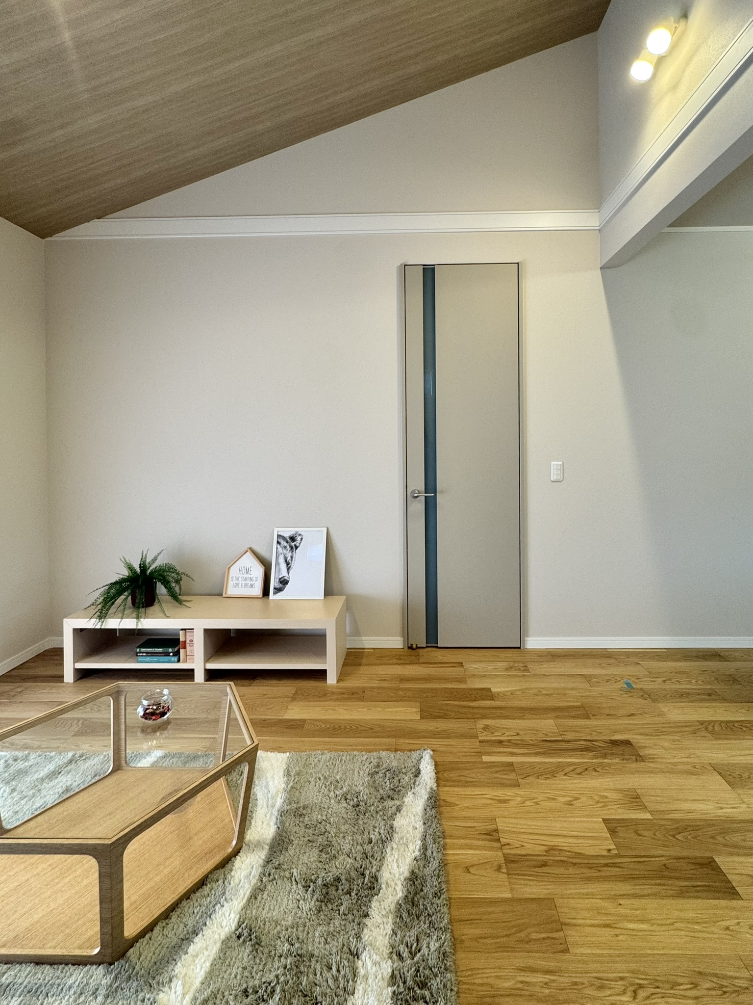 光がたっぷり入る、勾配天井の開放的なリビング。
