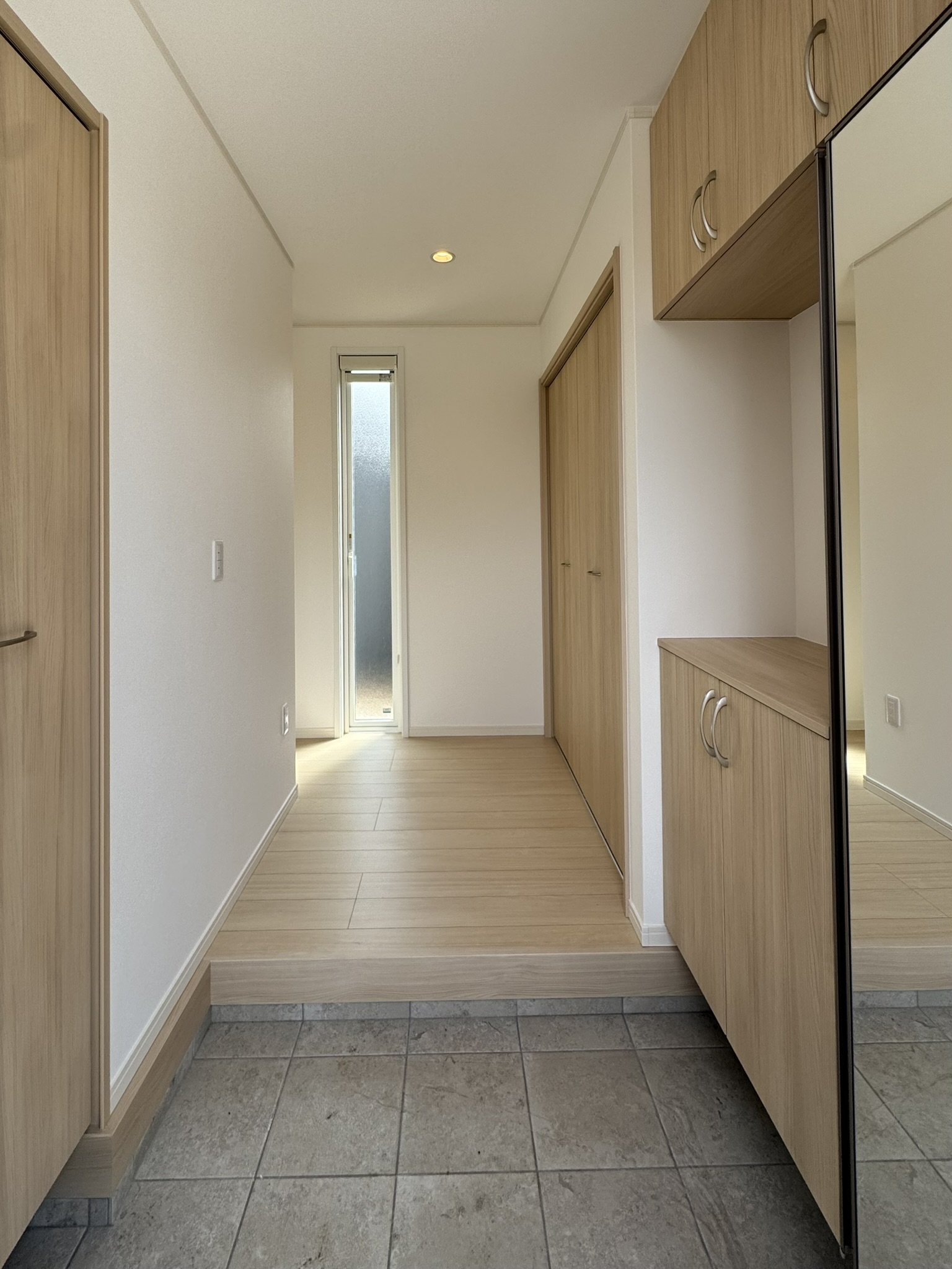 縦長スリット窓が玄関に光を招き、LDK+和室の一体空間が日常の広がりを生みます。