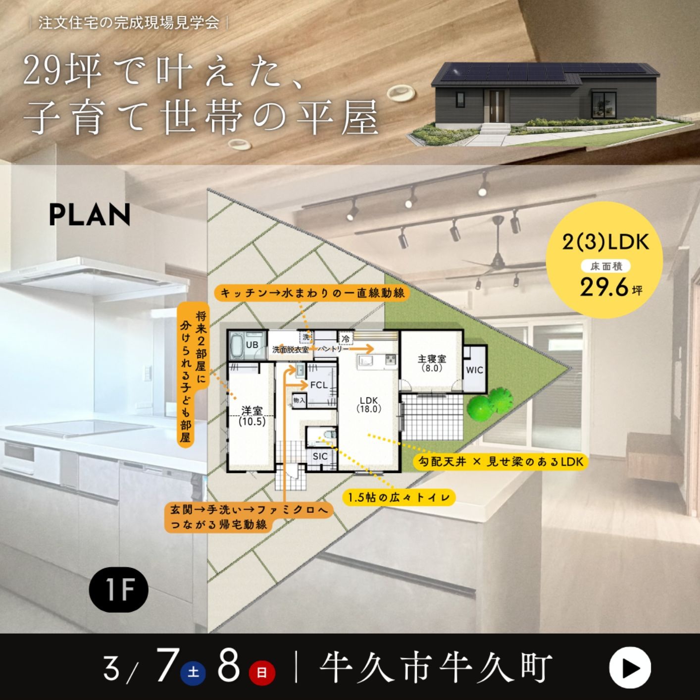 《3/7・3/8 注文住宅の完成見学会》29坪で叶えた、子育て世帯の平屋|牛久市