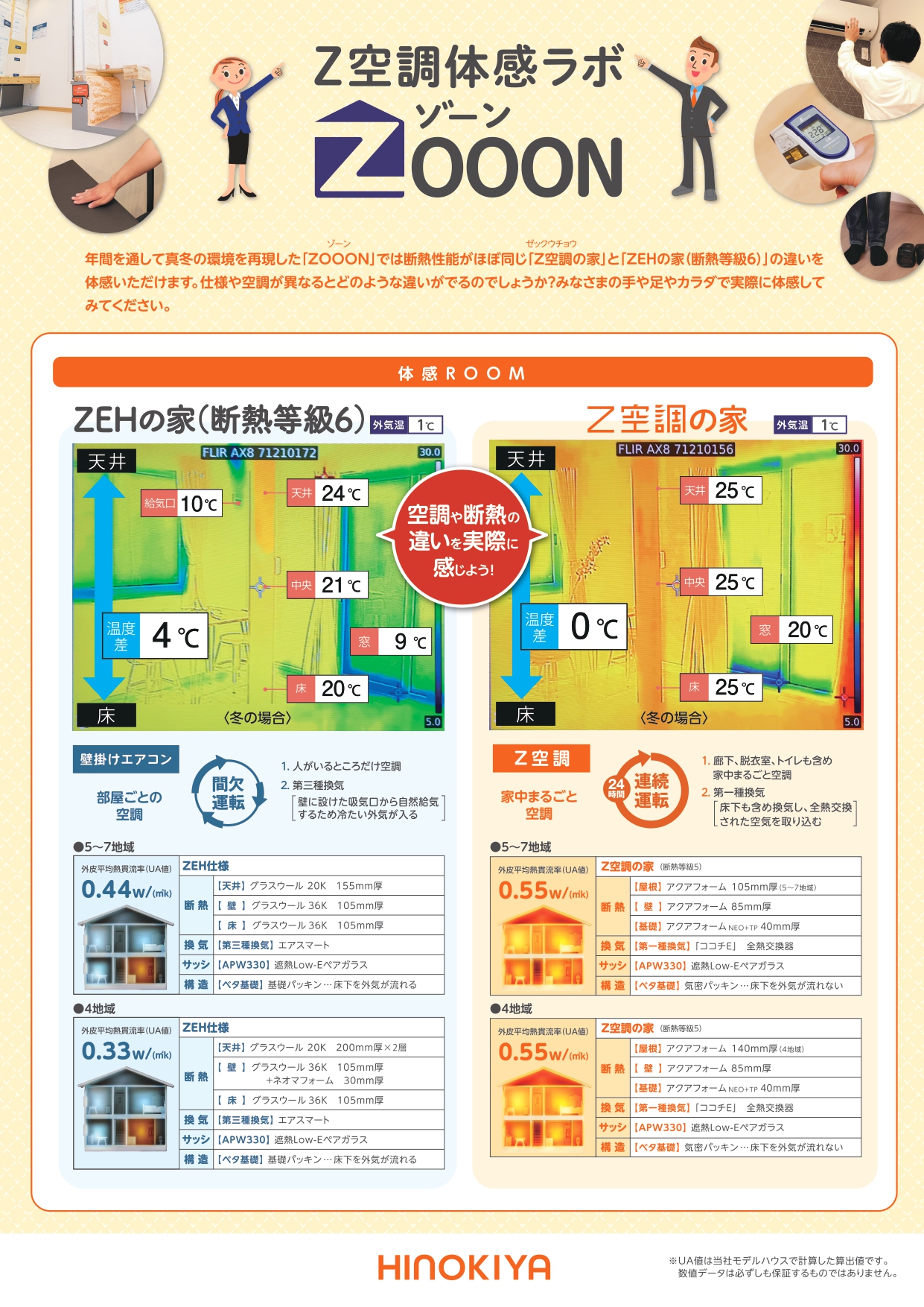 年間を通して真冬の環境を再現した「ZOOON」では断熱性能がほぼ同じ「Z空調の家」と「ZEHの家(断熱等級6)」の違いを体感いただけます。