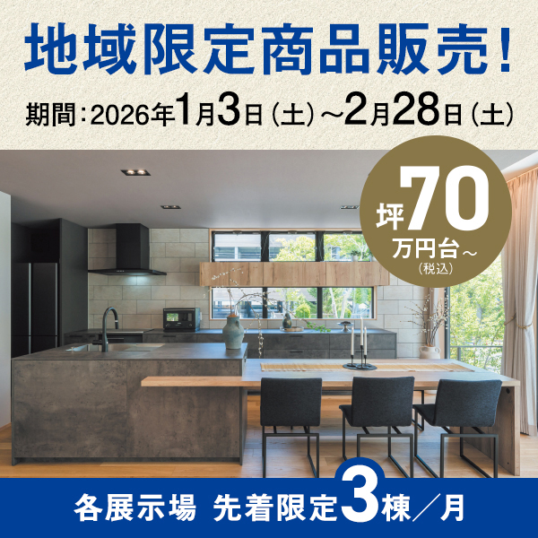 【木下工務店】地域限定商品販売! 2026年1月10日 最終更新日時 : 2026年1月22日 child 各展示場限定3棟 自由設計の住まいに、暮らしが豊かになる“上質な設備・仕様”を多数、地域限定でご用意しました。 販売期間:2026年1月3日(土)~2月28日(土) お問い合わせはこちら