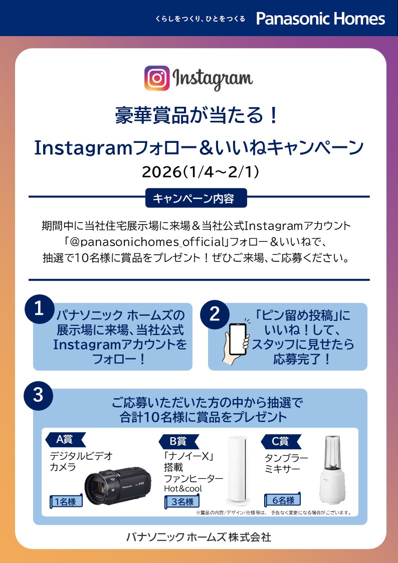 【パナソニックホームズ】Instagramフォロー&いいねキャンペーン 2025年12月23日 最終更新日時 : 2025年12月30日 child 展示場にご来場いただき、Instagramフォローといいね!で抽選で豪華賞品が当たります! 是非、この機会につくば展示場にお越しください。 公式インスタグラムはこちら お問い合わせはこちら